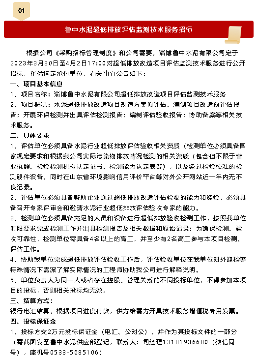 【招標(biāo)公告】魯中水泥超低排放評估監(jiān)測技術(shù)服務(wù)、鐵礦石招標(biāo)