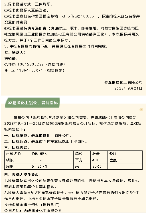 【招標(biāo)公告】鵬峰化工保溫材料、鋁板、扁鋼、螢石粉運(yùn)輸招標(biāo)