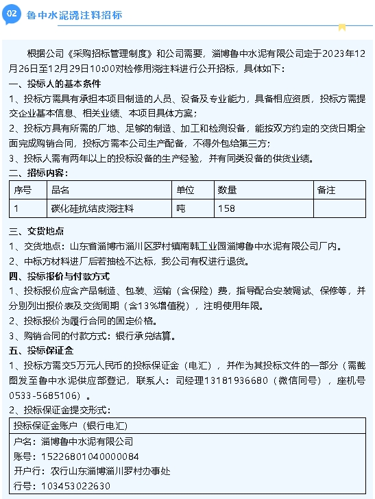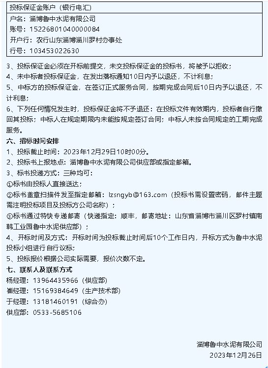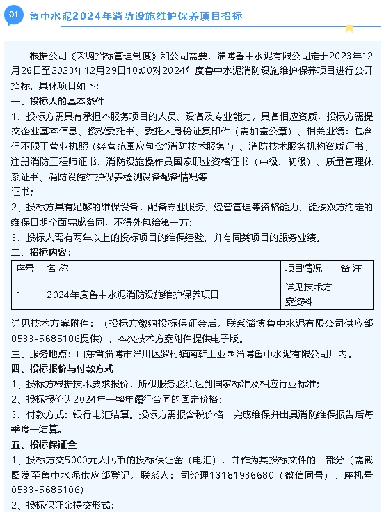 【招標(biāo)公告】魯中水泥2024年消防設(shè)施維護保養(yǎng)項目、澆注料招標(biāo)