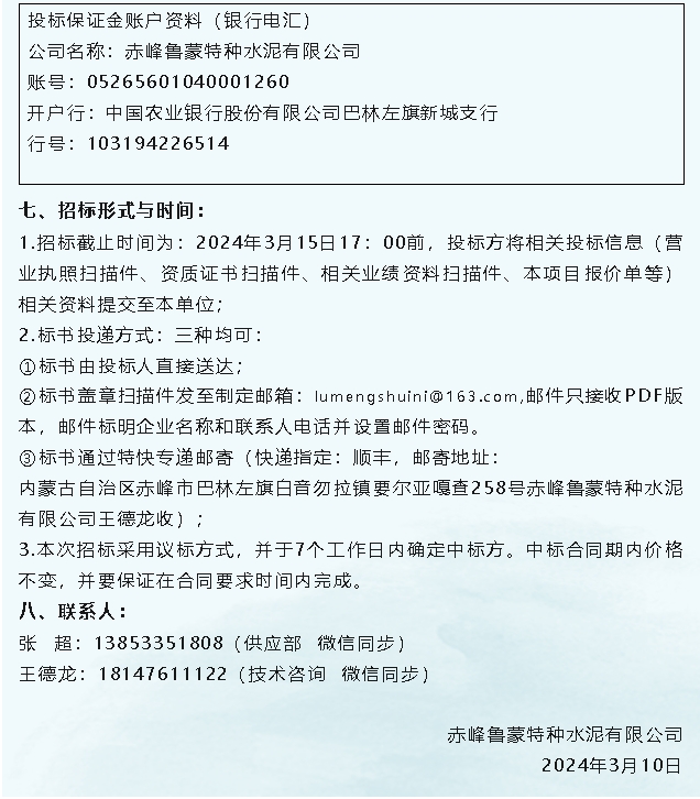 【招標(biāo)公告】魯蒙水泥水平衡測試工作招標(biāo)、鵬峰化工電纜招標(biāo)