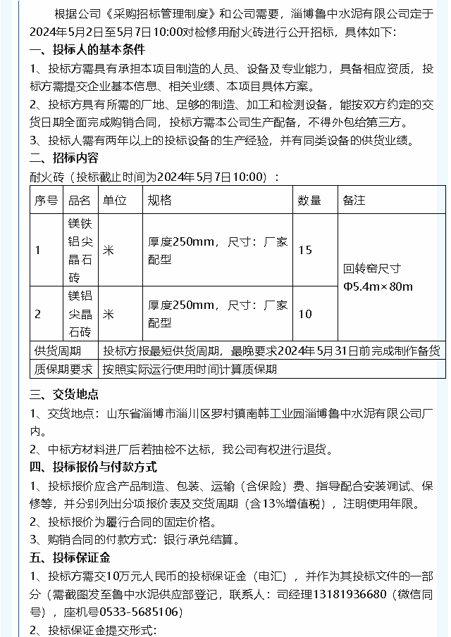 【招標公告】魯中水泥