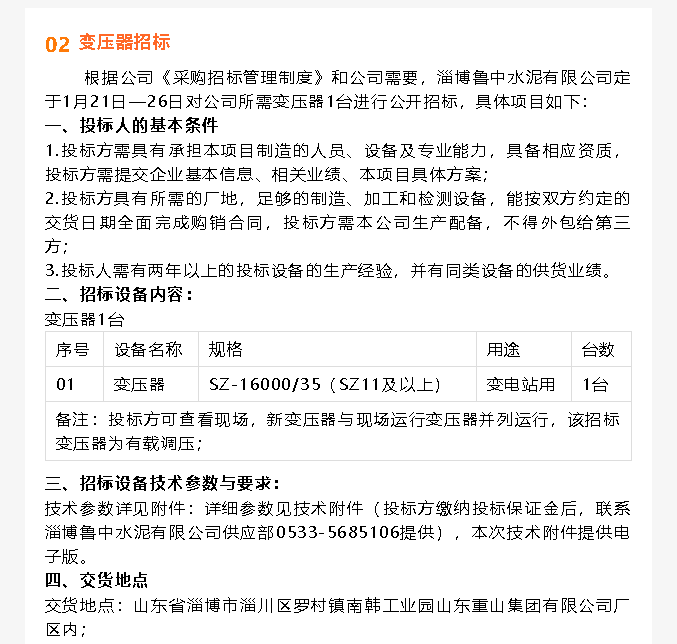 【招標(biāo)公告】魯中水泥提升機(jī)、變壓器招標(biāo)