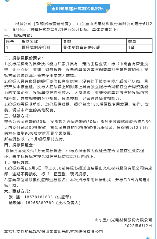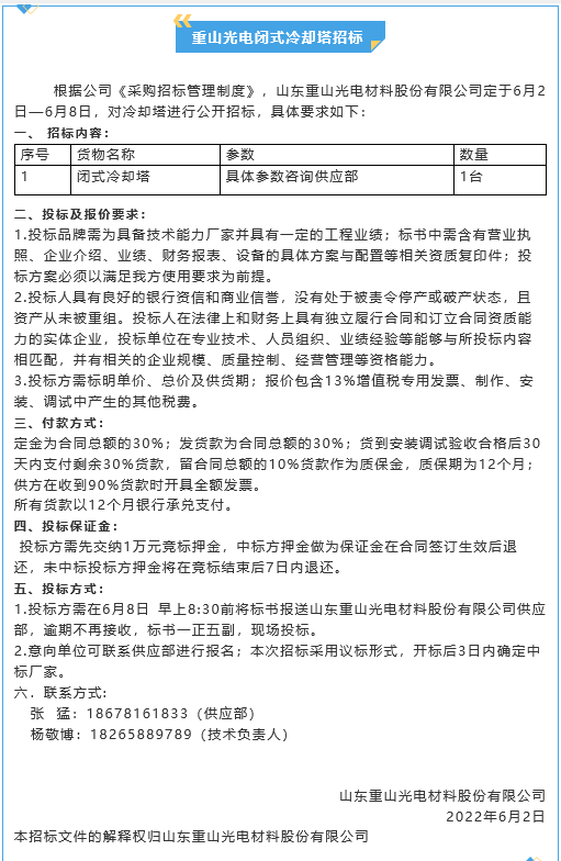 【招標(biāo)公告】重山光電閉式冷卻塔、冷凝器、螺桿式制冷機(jī)、整流器招標(biāo)