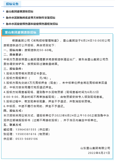 【招標公告】重山集團廢鋼渣鐵、魯中水泥新熟料庫皮帶天橋制作安裝、旋窯預(yù)熱器和旋窯預(yù)熱器框架招標