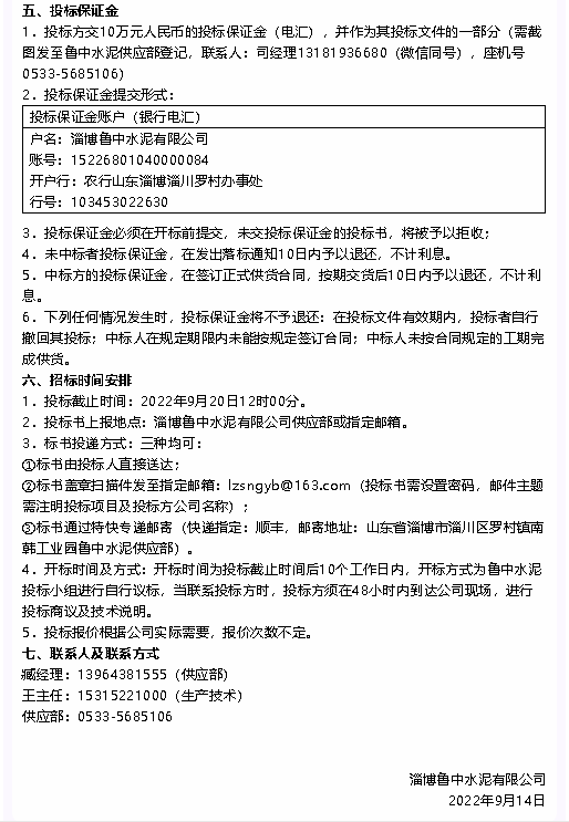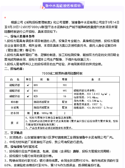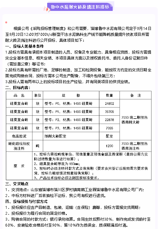 【招標(biāo)公告】魯中水泥耐火磚及澆注料、硅酸鈣板招標(biāo)