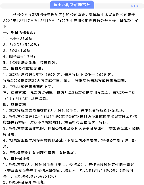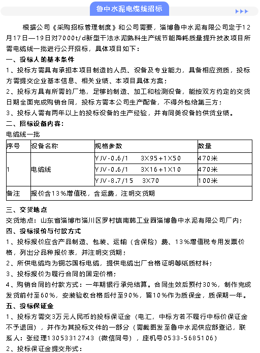 【招標(biāo)公告】魯中水泥鐵礦粉、電纜線招標(biāo)