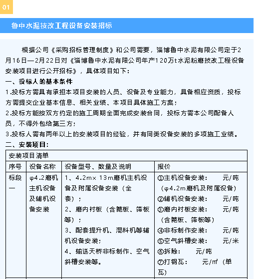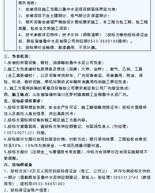 【招標公告】魯中水泥技改工程設備安裝、運輸招標