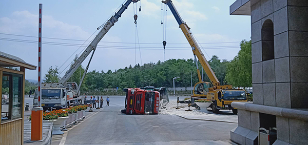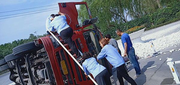 6月22日,正值大家正常工作的時(shí)間,一聲巨響打破了工作的寧靜。102省道由東往西的一輛河北籍重型卡車為躲避突然掉頭的車輛向公司正門西側(cè)猛沖過來,緊急的剎車讓車輛瞬間傾翻在地,滿載的數(shù)十噸石灰灑落一地。集團(tuán)總務(wù)處主任王宏得知消息立即向前查看詳情,側(cè)翻造成了駕駛室嚴(yán)重變形,貨車司機(jī)被困其中,無法動彈,傷勢不明。安保隊(duì)員陳萬鵬在第一時(shí)間撥打了120救助電話。怎樣把受傷人員從側(cè)翻變形的駕駛室中迅速救出來成了首先解決的難題。側(cè)翻的駕駛室目測有兩米高,需要搭梯才能進(jìn)入朝天的車門,時(shí)間不等人,早一分鐘救出傷員,他們的生命就少一份危險(xiǎn),安保人員用被撞壞的欄桿代替腳梯,由兩名值班門衛(wèi)扶著欄桿,陳萬鵬爬梯救人。頂著烈日,他不懼困難、奮力施救,汗水一滴一滴從頭上落下,侵透了衣衫,他顧不上抹去刺痛眼睛的汗水,心里只想著盡快把傷員救出。因?yàn)樨涇囁緳C(jī)體型偏胖,又被方向盤牢牢的卡住,為了避免貨車司機(jī)受到二次傷害,只能利用現(xiàn)有的空間慢慢把傷員往上拖,經(jīng)過半個(gè)多小時(shí)的時(shí)間終于把貨車司機(jī)順利救出,120醫(yī)護(hù)人員立即將他送往醫(yī)院進(jìn)行救助。隨后,王宏、王立群協(xié)調(diào)粉磨車間的宋濤、供料車間的王新剛等單位領(lǐng)導(dǎo)分別帶領(lǐng)部分職工和兩臺裝載車在現(xiàn)場待命,救出傷員后清理現(xiàn)場;協(xié)調(diào)的兩臺吊車待傷員救助后將側(cè)翻貨車吊起扶正,同時(shí)安保人員疏導(dǎo)現(xiàn)場交通,確保102省道和公司正門的交通安全。下午1:30左右,灑落的石灰清理完畢、側(cè)翻的貨車成功吊起扶正。救援結(jié)束后正值午時(shí),王宏安排兩名駕駛員到職工食堂就餐,細(xì)致入微的照顧讓兩名駕駛員感動不已。身在異鄉(xiāng)的謀生者感到了如親人般的溫暖,他們激動的握著王宏的雙手,表示真心的感謝。不善言談的貨車司機(jī)在晚上給王宏發(fā)了微信紅包,并對重山集團(tuán)的這次義務(wù)救援表示深深的感謝,王宏婉言謝絕了他的好意,向他表示:我們重山人做事都要對得起自己的良知,不求任何回報(bào)的。這是我們應(yīng)該做的。用實(shí)際行動詮釋了致良知思想的內(nèi)涵和意義,充分體現(xiàn)了重山集團(tuán)的社會擔(dān)當(dāng)和致力構(gòu)建和諧社會的決心。